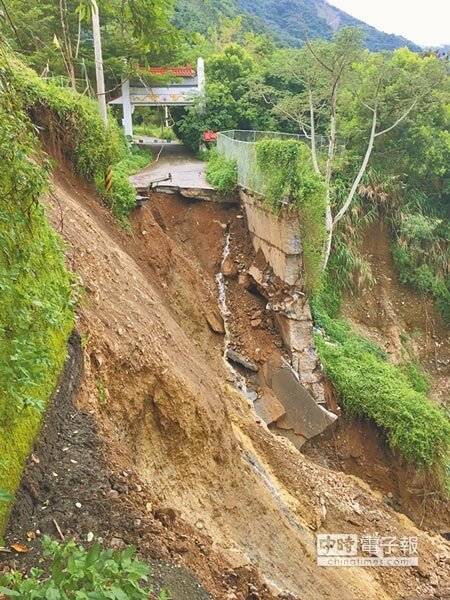 中國時報【沈揮勝/南投報導】雙颱新中橫沿線帶來不小雨量、土層鬆軟,通往信義鄉示範公墓的九層坑產業道路,1日清晨被發現有數10公尺的路基完全滑落山谷,由於垃圾轉運站也設在裡面,未來將有相當時日,殯葬與垃圾處理,都變成棘手問題!信義鄉長史強表示,崩塌點位在道路起端約1公里處,鄉公所獲報立即召開民政課、建設課及清潔隊等主管前往勘查;鄉代會主席邱瑞榮與祕書陳鴻鎮會勘後評估,路基完全墜落深谷部分約30多公尺,但災情仍持續擴大,若再下雨,恐坍得更嚴重。鄉公所祕書莊進忠指出,九層坑後山還有大面積的墾作地,至少有6、70公頃的葡萄園、夏季蔬果和梅子製品加工廠,平時進出農民很多,耕作或採收高峰期甚至每天百車、數百人進出;如今路斷了,上工靠徒步、採收靠接駁,農民皺眉頭。尤其喪禮送終,靈車進不去!如果純是運骨灰安奉納骨塔,還可利用800CC四輪傳動小貨車從後山遠繞,來回多花2小時可達,但後山路窄陡峭、徒增風險;若是土葬因棺木體積大,靈車不得其門而入。至於垃圾轉運站,需立即擇新址替代,這種不受歡迎的設施場域,設在公墓旁倒是與社區民眾相安無事,但若設在民宅、農地旁,恐大家意見擺不平;當務之急是盡快把路搶通,評估修復時程要超過1年,目前考慮先闢便道,最快半個月可讓小車通行。