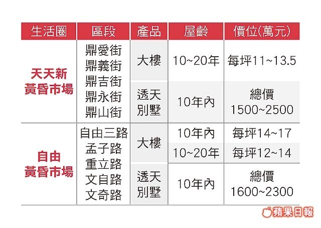 李俊德指出,自由黃昏市場周邊大樓多,其中以屋齡10年內大樓市場需求量最大,每坪14~17萬元,主力總價550~700萬元,部分屋齡10~20年的大樓,因總價較低,對首購族也具備吸引力。