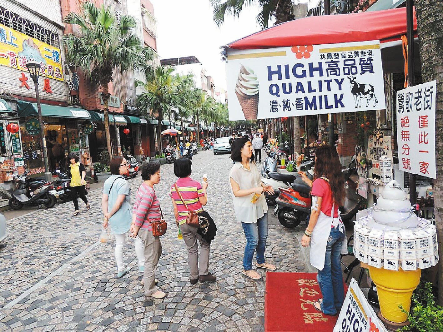 豔陽高照的周末午後,鶯歌陶瓷老街上三三兩兩的遊客隨性漫步,偶爾晃進陶藝品店,也只是看幾眼就離開;遊客似已習慣來老街「吃支豬血糕、香腸就回家」,不再選購陶瓷。
