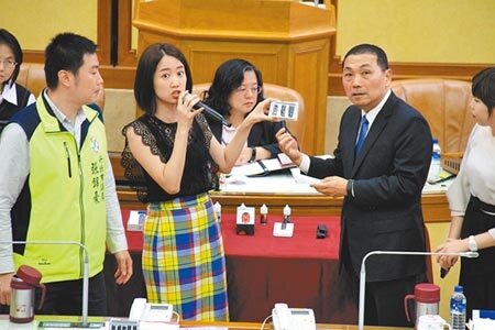新北市議會民進黨團議員昨天邀新北市長侯友宜辨識電子煙種類,讓他看得「霧煞煞」。(圖/譚宇哲攝)