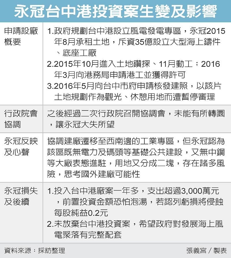 能源大廠永冠規劃在台中港斥資35億元設廠案生變,台中市政府將做為發展觀光、休憩用地,決定「暫停審理」。永冠前置作業已投入逾3,000萬元恐將泡湯,對政府決策感到失望,考慮將這件海上風電鑄件、底座廠投資案移至海外進行。