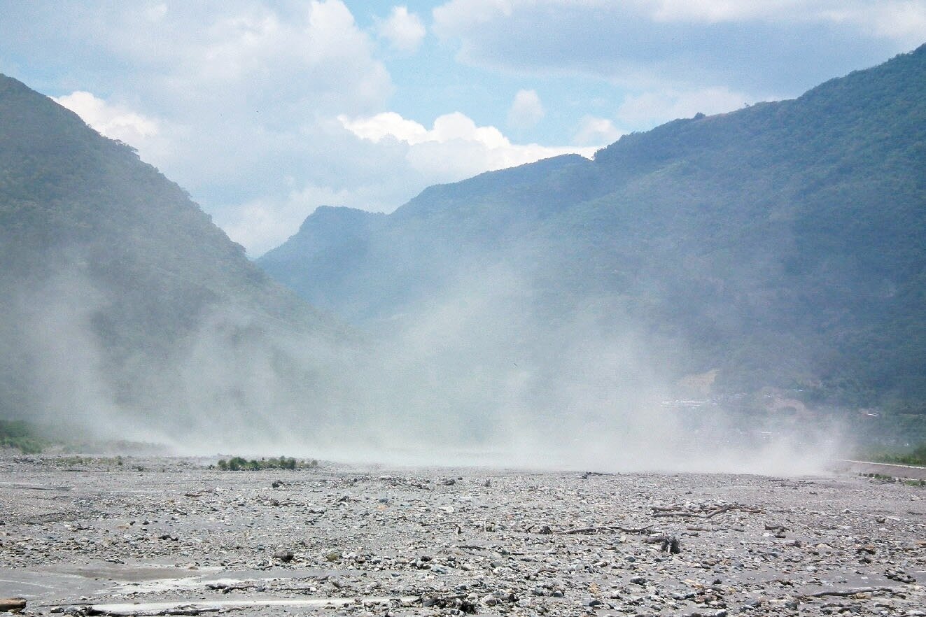 強風延著太麻里溪一路吹到上游的嘉蘭村,河床布滿飛沙走石。