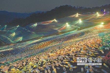 昨天遊客前往現場,對眼前的景象感到相當驚奇,在深山之中,竟有著如此繽紛的色彩點綴草地,形成一幅令人感動的圖案,入夜後,燈光投射在400萬支寶特瓶上,聲色變幻讓整片綠地「活了起來」,就像是精靈在跳舞般,十分美麗。