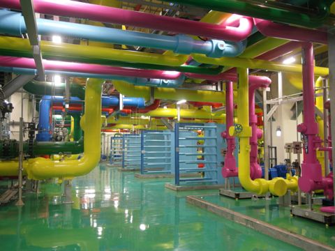 資料中心內以不同的顏色區分不同的送水管,包括低溫水冷卻水、冰水等,管理者從不同顏色能辨別水路方便故障時維修。 (擷取自ithome)