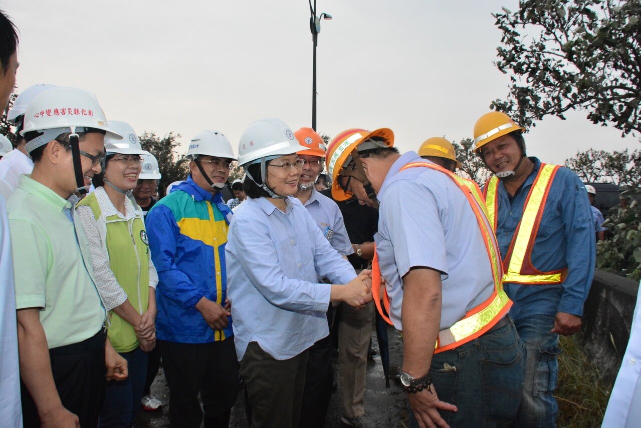 本報記者/連線報導總統蔡英文昨天到桃園、苗栗、彰化、台中等地為加班趕工的台電人員打氣,她說,颱風接二連三來,令人感動的就是台電第一線搶修人員;民眾都想在最短時間恢復供電,沒有電的時候大家很痛苦,在等待恢復供電時,也是台電人員最辛苦時候。行政院長林全,昨天也到宜蘭視察;他說,第一線工作人員最辛苦,這次颱風整體來說有進步。