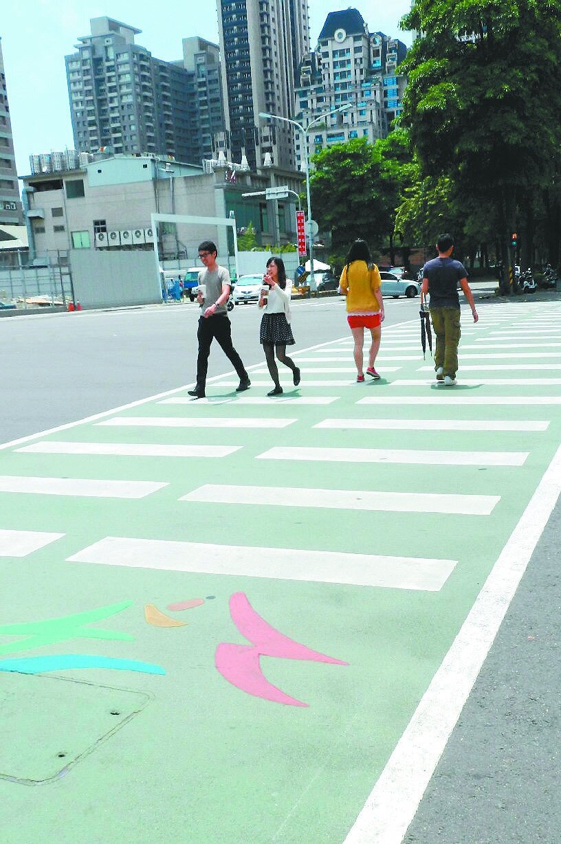 台中市府交通局強調「行人優先,請多禮讓」,也設計出「綠斑馬」;交通局長林良泰說,將行人穿越的路面塗上綠色,把路口行走空間清楚區隔,有的還畫橘色腳丫提醒行走方向。