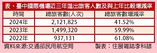 根據交通部民用航空局資料,2023年台中國際機場總旅客人數已突破200萬人次,中央政府同步推動「台灣地區民用機場2040年整體規劃」,將台中國際機場定位為「區域門戶」,預估2040年旅客量將達400萬人次。