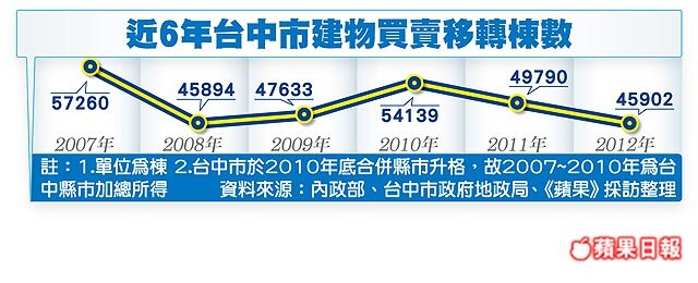 台中市政府地政局昨公布2012年12月建物買賣移轉棟數為3853棟,較11月減少4.8%,總計去年全年為4萬5902棟,不僅較2011年減少7.8%,近5年來也僅高於2008年金融海嘯時的4萬5894棟。