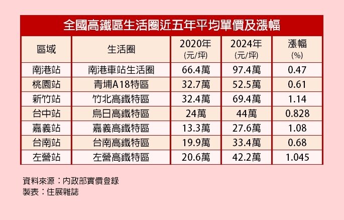 觀察過去高鐵為進駐地區帶來的影響,除促進當地商業活動外,周邊生活圈的房市也通常迎來顯著發展,以實價登錄資訊為例,北部高鐵南港站、桃園站、新竹站周遭生活圈近5年房價,分別上漲46.5%、60.6%、114.2%;台中烏日高鐵站上漲82.8%;南部嘉義、台南、左營站分別成長107.5%、67.8%、104.5%。