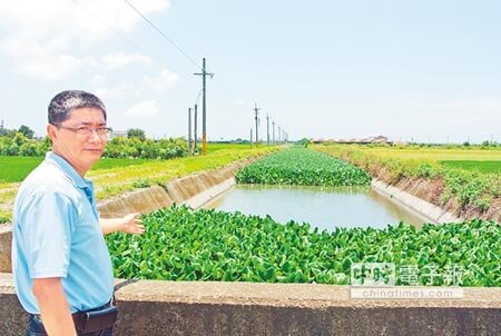水林鄉番薯厝大排布袋蓮覆滿水面,恐阻塞水門釀災。(記者張朝欣/攝影)