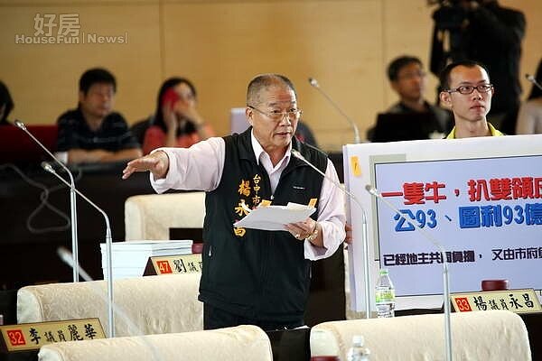 楊永昌議員質疑,公93公園用地「一隻牛剝兩層皮」圖利93億元、黎明污水場 3400坪土地市值27億元被污了、交6用地以市價徵收涉嫌圖利財團等,他要求市府將相關人員移送法辦,一星期查清楚;楊議員並要求地政局長曾國鈞應負責下台,但市長胡志強力挺說「他又沒有錯!」