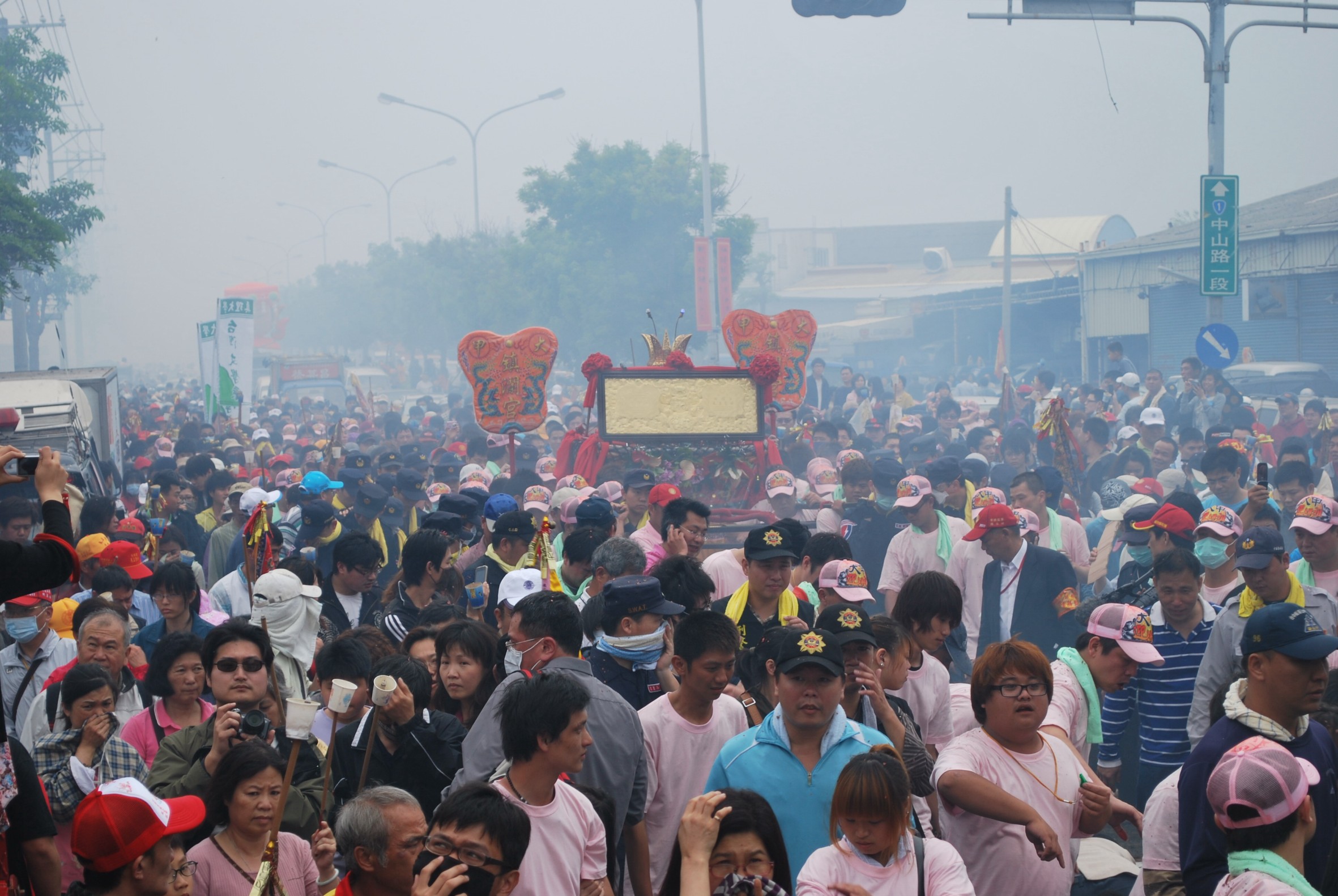 大甲媽祖九天八夜遶境進香,十五日回鑾大甲區,數十萬國內外遊客湧來參觀,陣頭、人潮夾雜著震耳欲聾的鞭炮、煙火,加上從大甲溪至市區,全程倰轎腳的阻礙,致遊街緩慢,場面熱鬧。〔記者陳榮昌/攝〕