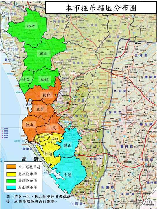 高雄市11個行政區違停委外拖吊自去(102)年12月底完成招標後,民三區拖吊場(負責楠梓、左營、鼓山、三民區)103年3月1日將先上路。另外,公營橋頭拖吊場亦將同步執行橋頭、岡山、梓官、路竹區的違停拖吊。