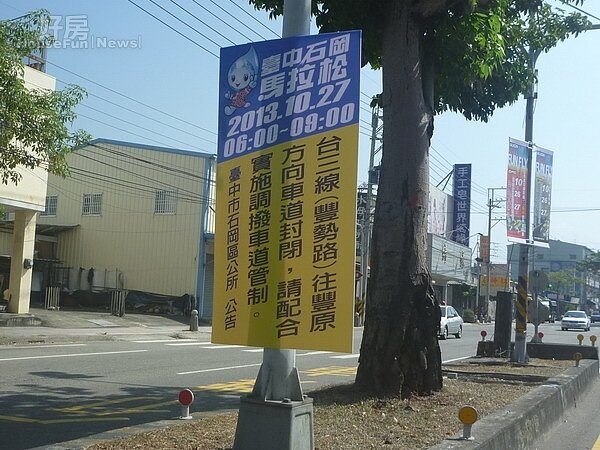 石岡馬拉松訂於本週日開跑,區公所已在主要道路懸掛交通管制告示牌。(記者黃玉鼎攝)