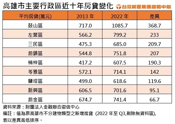 台灣房屋集團根據財團法人金融聯徵中心新增房貸資料統計,高雄平均房貸增加最多的是鼓山區,十年之間增加了368.7萬元,2022年房貸金額來到1085.7萬元,為市區中房貸增加最多,也是唯一房貸負擔破千萬元的行政區,榮登千萬負債王寶座。