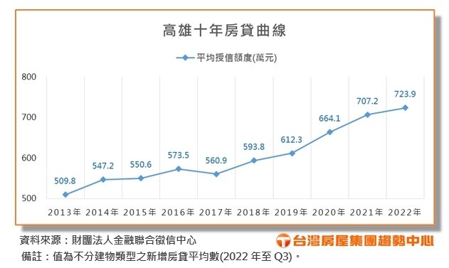 而觀察高雄近十年平均房貸表現,十年前平均房貸負擔僅509.8萬元,除了2017年微幅緩跌外皆年年攀升,2020年開始更火力加速,連兩年以年增40至50萬元力道衝高,而至2022年第三季為止,平均房貸已達723.9萬元,進入高雄十年來,也是聯徵史上最高點!