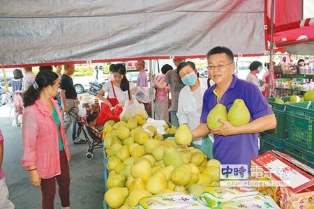 今年麻豆紅柚提早在中秋節前夕上市,台南市農會假日農市舉辦促銷活動,民眾紛紛搶購。(記者黃文博/攝影)