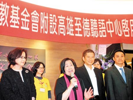 辜嚴倬雲主持高雄至德聽語中心揭牌表示,高雄資源不足,聽障者南北往返治療很辛苦,為此募集社會力量設立中心,讓聽障者能有快樂美麗的生活。