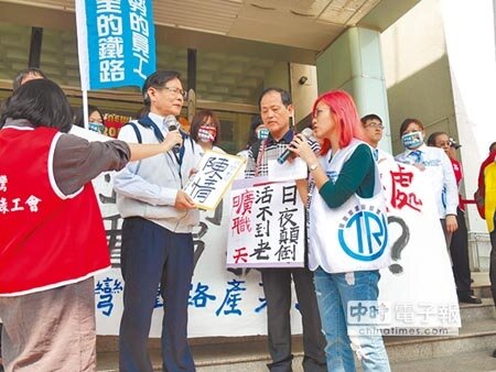 台鐵針對春節缺勤員工寄出370份曠職單,桃園有17名收到曠職單的員工向工會陳情,其中7人面臨被記過處分的桃園站員工,手拉「鐵路局惡意懲處、勞動局挺誰?」白布條,口戴「支持產工、休假無罪」口罩,要求勞動局表態力挺勞工,勞資關係科長馮飛燿代表接下陳情書。