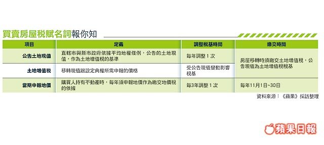 近期台北市公布2013年「公告土地現值」,全市公告土地現值平均漲幅近1成,這代表民眾未來賣屋時,須負擔更重的「土地增值稅」。專家表示,依謄本上的名詞,「公告土地現值」牽動買賣房屋會產生的「土地增值稅」,「當期申報地價」為民眾每年須繳地價稅的基準。