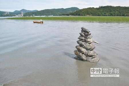 直到昨天水位回升到746.31公尺,離滿水位748.48公尺只差2.17公尺,潭水終於漫過淤泥土堆淹到兩蛙,九蛙疊像正式告別陸地,讓管理單位最頭疼、防不勝防的「遊客爬蛙拍照」行徑,可望暫時終止。