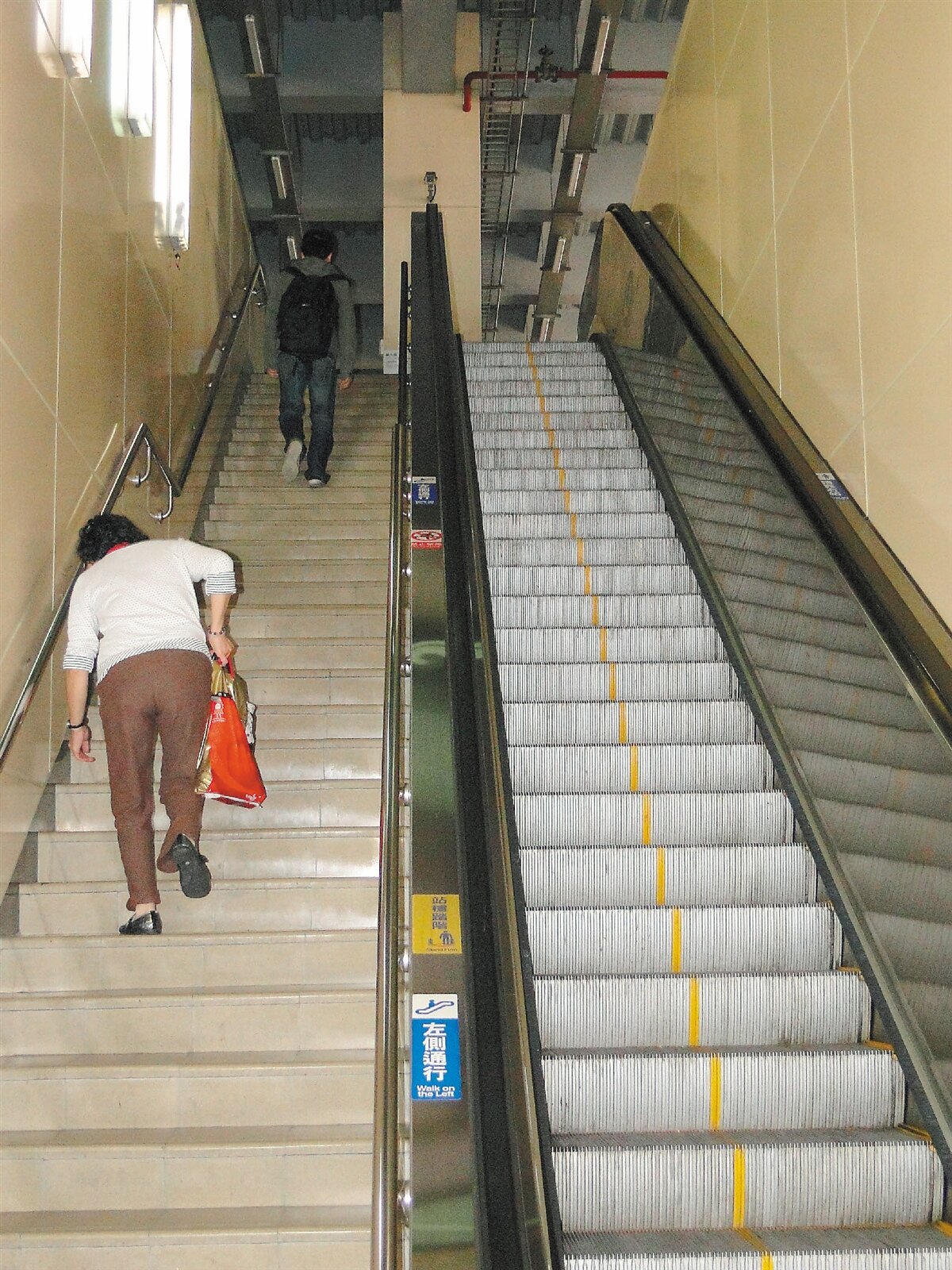 基隆市七堵火車站第3月台電扶梯故障10多天,一名婦人費力地走樓梯上月台搭火車。(記者游明煌/攝影)