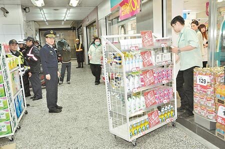 新竹縣竹北分局長鍾孝平帶隊在竹北市博愛街取締路霸,占用騎樓的商家趕緊將貨物搬進店內(羅浚濱攝)