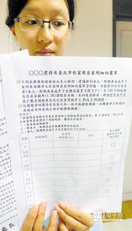 北市稅捐處副處長謝鳳珠回應,房屋明細回覆單是由財政部統一訂定的版本,納稅人可選擇房屋現值較高的當自住房屋,課徵1.2%稅率,超過第4戶以上則以1.5%至3.6%非自住稅率來課徵,但她坦承表格設計倉卒,民眾可透過郵寄或傳真到各稅捐處,而稅率仍依照議會的最終定案。