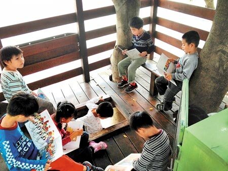 陸豐國小擁有1座「夢幻世界閱讀樹屋」,小朋友在下課時間都會相約到此享受涼風與閱讀。(記者魯鋼駿/攝影)