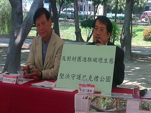 針對台南小巨蛋案,市議員蔡旺詮偕同前立委王幸男及台南大學校方代表,23日共同召開記者會。蔡旺詮重申台南小巨蛋堅決反對財團介入經營,破壞當地的文化生態綠廊,否則維護小巨蛋週遭的生態及文化與生活品質,不排除串連環保生態團體及當地居民進行抗爭。