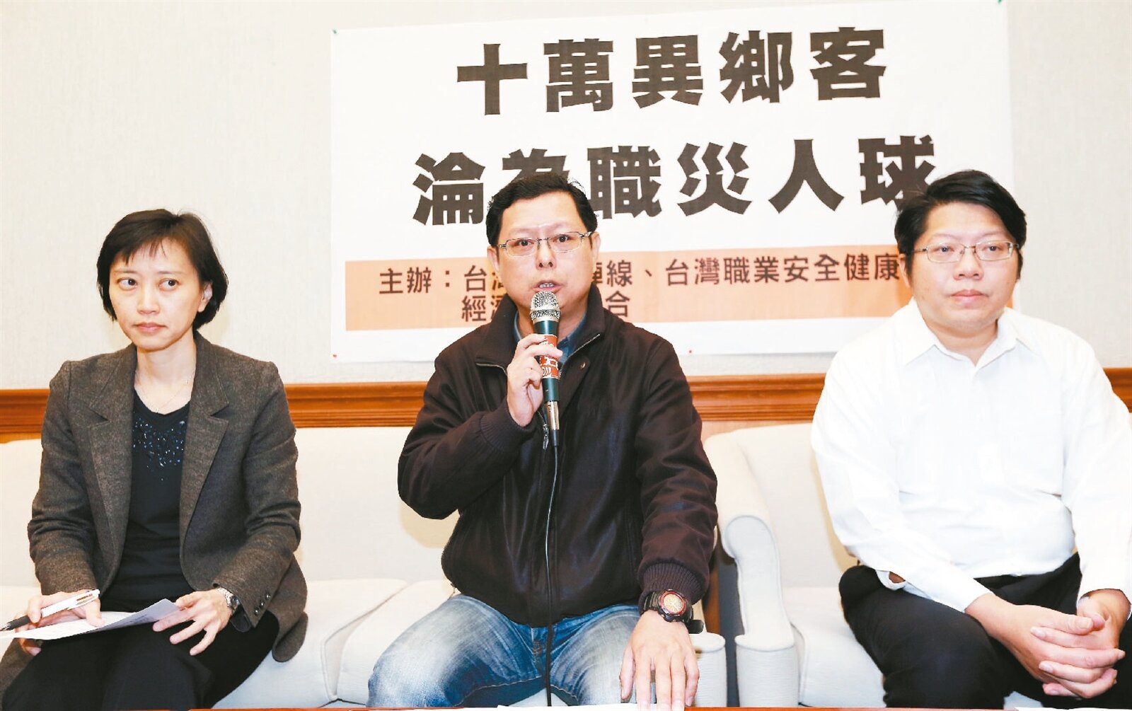 勞工陣線今日舉行「十萬異鄉客淪為職災人球」記者會,台灣勞工陣線秘書長孫友聯說,根據統計,到今年10月底,共有9.4萬名商務人士核准來台,預計到12月底將突破十萬人,而這些異鄉客都有可能淪為職災人球。