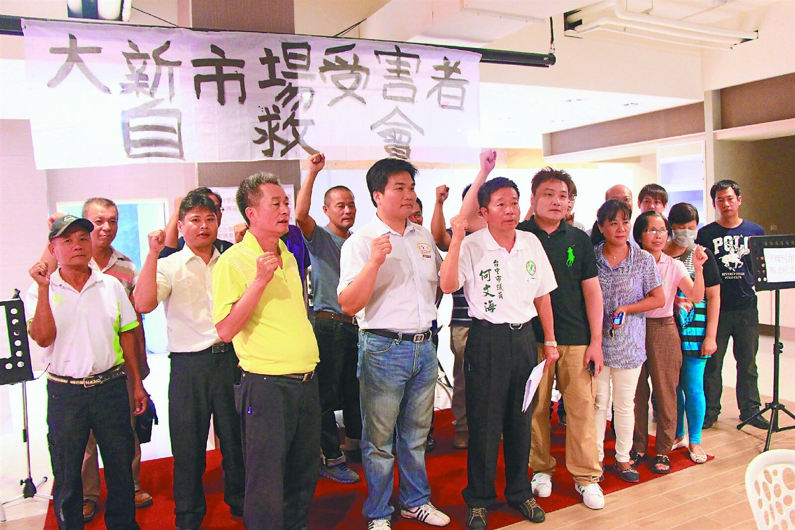 30多名包商與攤商代表昨聚集在大新公有市場二樓廣場組成自救會,在市議員何文海帶領下呼喊口號,要求市府出面。水電消防承包商蔡忠龍說,所有工程今年3月完工,至今未拿到一毛錢。建設公司委外招商的何姓業者說,已繳100萬元租金給建設公司,市府若解約,他們也無法繼續經營,希望市府代討回公道。
