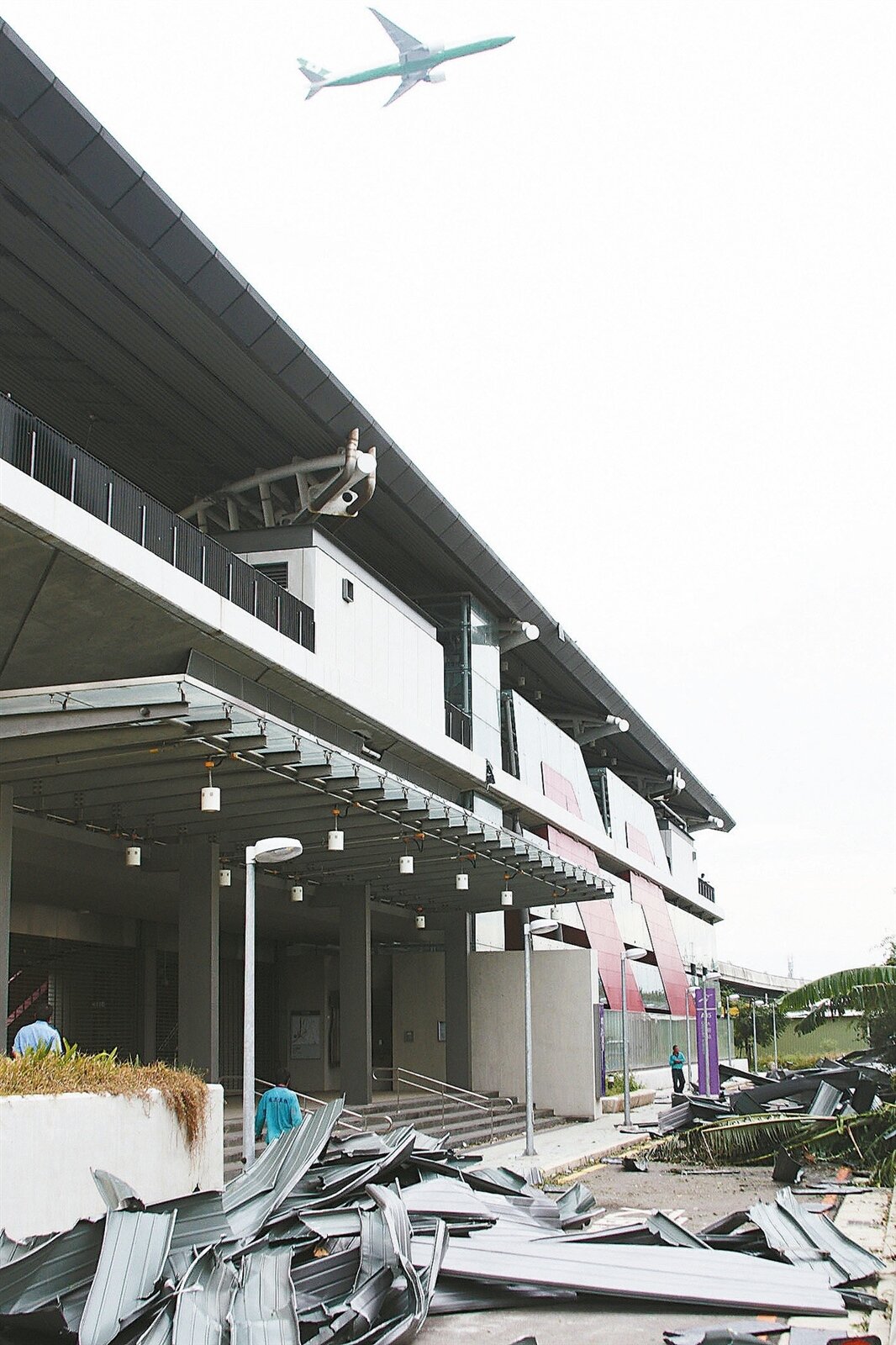 機場機運各捷運站體已完工,A15大園站、A16橫山站設計新穎的屋頂,還沒啟用就擋不住蘇迪勒颱風來襲,屋頂鋁合金鐵皮被掀開、散落滿地,殘破不堪,也引發民代及民眾對機捷施工品質的質疑。