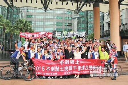 「不倒騎士‧挑戰千里」自行車環台活動,今年已邁入第5年,33名癌友和親友、志工等60人,經過10天旅程、15個縣市,10日下午抵達終點站新北市,由副市長侯友宜接風。「我們只是在人生路上跌倒了,把灰塵拍掉,還是可以再站起來!」