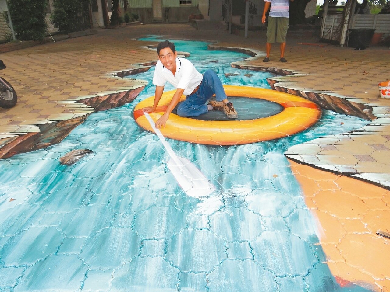 曾進成說,這幅取名「地心歷險」的魔幻3D立體地畫,呈現陷入險峻山谷溪流,坐在圓形的橡皮艇企圖力挽狂瀾,雖掉入地火岩漿,仍化身為浴火鳳凰,飛向天空意味浴火重生。