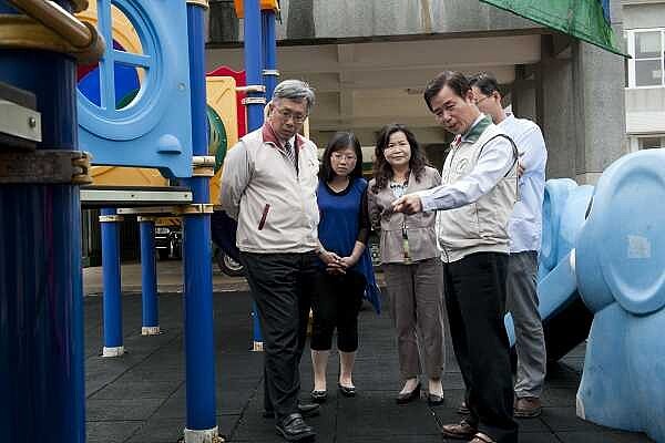 大安幼兒園漏水,建設破舊,直接影響小朋友安全,民代與市府官員13日會勘,教育局副局長葉俊傑當場指示幼教科長設法於短期內協助解決。(記者陳榮昌攝)