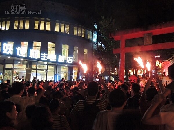 於是,沉寂的森林裡有了更多熱鬧的元素,首先由天狗點燃火把與擊鼓祈福揭開序幕,緊接著由枯麻、巴豆、山大王與群妖們的熱舞帶動遊客高漲的情緒,沒想到一群來意不善的惡靈,張牙舞爪的揮動手中的火把,帶來精彩的、黑夜裡的「火舞秀」,現場遊客無不鼓掌叫好!隨即,四個惡靈被天狗收服為隨從,並命名為侍八衛,贈與律牌、手銬,往後將跟著天狗保衛到溪頭來的每位貴賓的安全,天狗灑下祈福之米,於是妖怪村裡的妖怪們在天狗的帶領下,帶著所有的遊客遊行,黑鴉鴉的人群、熱鬧的氣氛將妖怪村妝點的越夜越美麗!