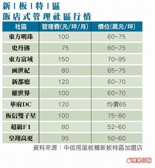 中信房屋板橋新板特區加盟店經理林英全表示,新板特區內有17個社區,約3300多戶住家,大部分皆採飯店式管理模式,有知名建設公司成立物業管理公司,由建設公司自行管理,更了解大樓維修、管理狀況。如:偉康建設即有自家物管與保全人員。目前新板特區飯店式管理社區管理費用每坪80~150元,一般大樓管理每坪30~60元。