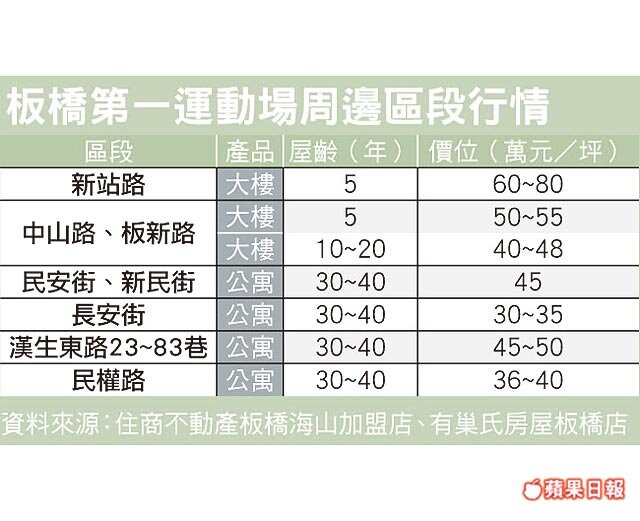 住商不動產海山加盟店店長王建雄表示,第一運動場周邊路段以新站路房價最高,屋齡5年內的大樓,每坪成交價60~80萬元,分析該路段成交價差近20萬元,是因為新站路與中山路由大陸建設施工的建案「橋峰」;該案基地面積逾3000坪,37層樓高,近深丘公園,每坪成交價衝至80萬元。規劃小套房為主的「高更」案,每坪成交價格約60萬元。