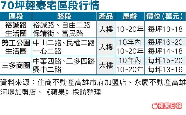 高雄市新成屋豪宅開價每坪多在30萬元以上,總價至少2000萬元,是許多民眾遙不可及的夢想,但70坪左右的中古輕豪宅,可使用空間充足,但總價只要新豪宅一半,屋齡雖稍舊,仍吸引許多購屋族。
