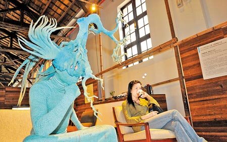 第一屆台北設計城市展中,形貌獨特的街頭藝人,在裝置藝術空間裡遊移,希望營造出台北街頭的城市氛圍。(王爵暐攝)