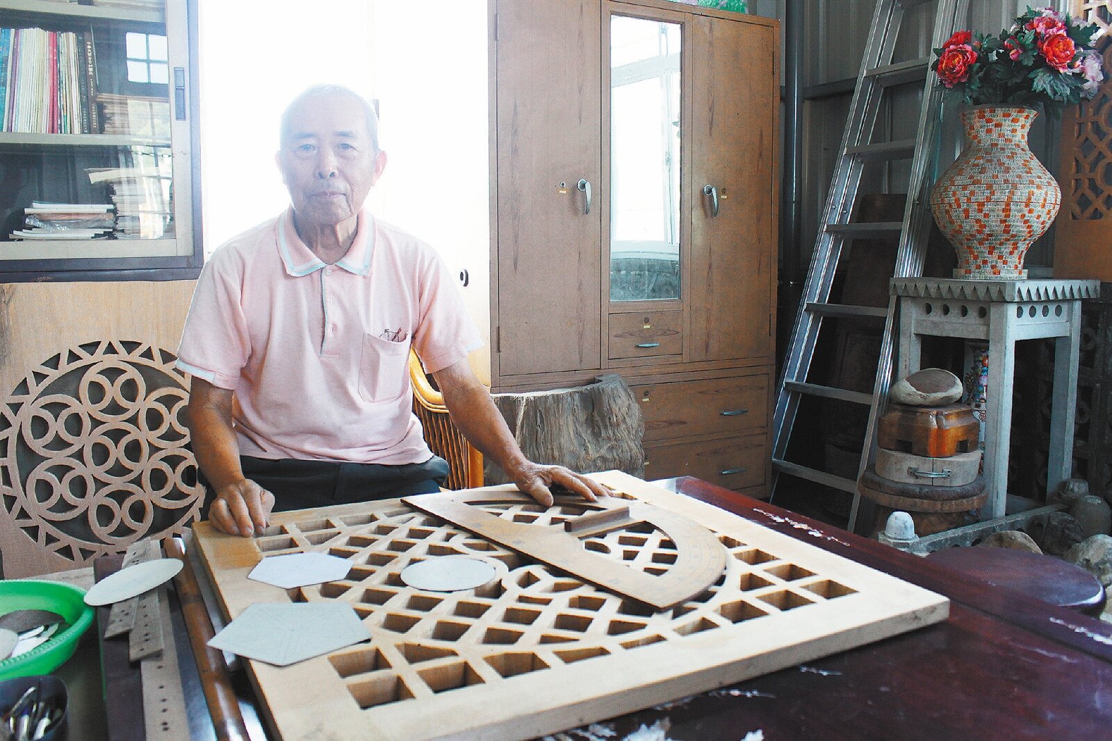 徐崑榮利用舊家具、廢木料雕刻窗花,家中堆滿作品就像博物館。(記者蘇木春/攝影)
