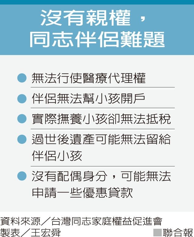 目前民法對婚姻的規定仍要求一夫一妻,收養小孩必須先有夫妻身分;法界人士指出,在立法院未修法前,同志想爭取伴侶權益、收養小孩是緣木求魚。
