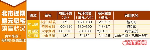 至於市場上的億元豪宅銷售狀況,如「松江1號院」去年公開至今,每戶總價2.6億元,已售逾7成,甲山林廣告總經理張境在透露,這2周還有2戶成交,表示高總價產品買方仍在。每戶總價逾1億元的「華固松疆」目前銷售逾5成,因看好未來價格,14樓以上戶數將等成屋後才銷售。