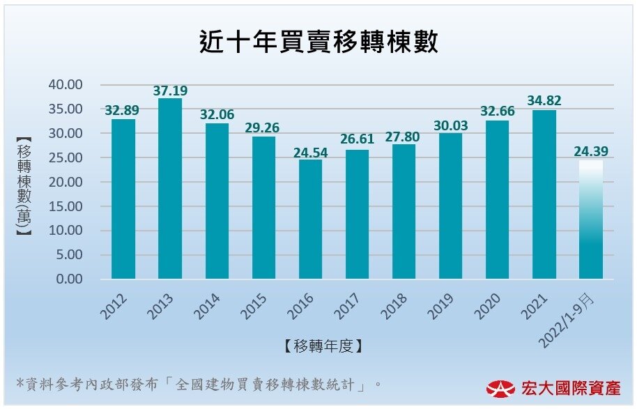 最後是看建物買賣移轉棟數減幅是否少於3萬戶,據宏大國際資產統計,內政部自2012~2021年間的每年買賣移轉棟數,平均每年增、減棟數約2萬9460棟、近3萬戶。陳益盛指出,如今年移轉件數減少低於3萬戶,顯示民眾對於房市信心不至於太差,若大於3萬戶,甚至明年下探達2015~2016年間的年減4萬7156棟,才顯示購屋信心悲觀。