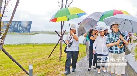 立法院教育及文化委員會28日視察故宮南院,遇上午後狂風驟雨,立委陳亭妃、陳明文和縣長張花冠、故宮院長馮明珠等人在偌大的戶外園區邊走邊聽報告,全淋成落湯雞,另通往主體景觀橋排水不暢、室內則因防水工程還在趕工,導致庫房地板積水不退,張花冠建議裝設遮雨廊、亭,避免觀展遊客遭雨襲。