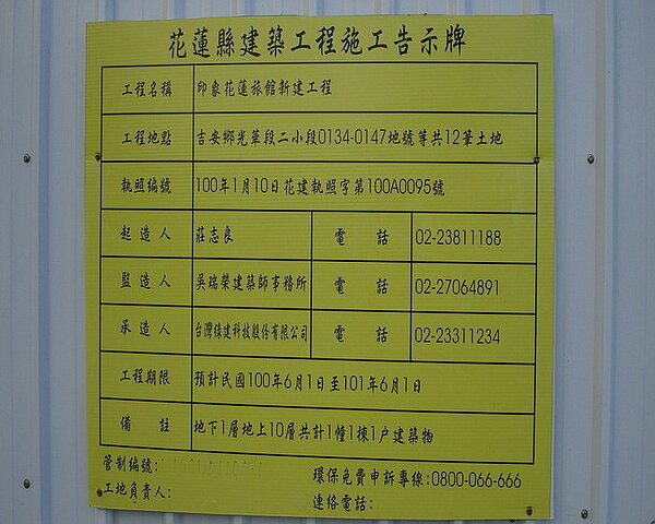 台開公司要在吉安鄉光華段,也就是光華工業區內興建一幢地下一層地上十層的印象花蓮旅館,工程預期字100年6月1日起至101年6月1日完工,但是現在即將進入11月,施工現場並沒有施作跡象,整個工地被鐵皮圍起來,遠遠由上而下看進去,僅有一片突起的土丘較為醒目。
