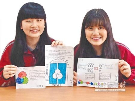 基隆女中柯俞亘(右)、黃韻庭(左)兩位同學開心展示遊戲企畫草圖。(黃靖惠攝)