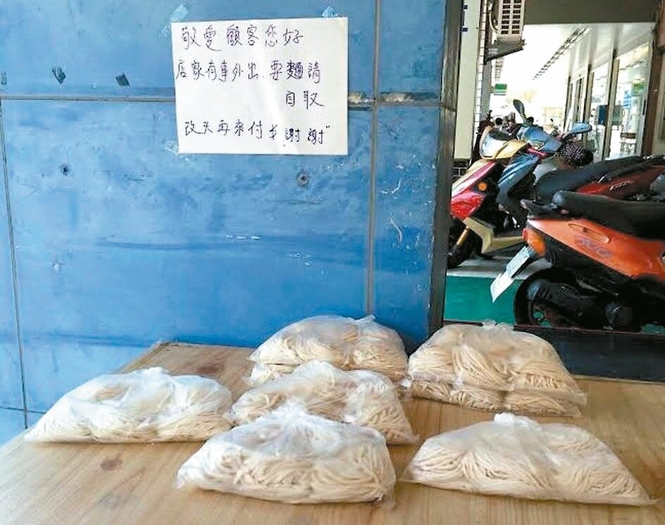 高市前金區自強路上一家製麵行鐵門拉下,卻在騎樓擺了張桌子,桌上有好幾包生麵條,旁邊一張紙寫著「敬愛的顧客您好,店家有事外出,要麵請自取,改天再來付$,謝謝!」