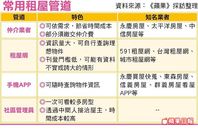 若民眾不想花太多時間找房子,可委託仲介公司介紹物件,馮麗芳表示,選擇知名度高的公司較有保障,事前也要問清楚服務流程、收費方式,有些小型公司標榜服務費只收2000~3000元,但僅提供物件資料,不承辦帶看屋服務,但有些房仲成交後會向房東、房客收取仲介費,民眾都須問清楚。
